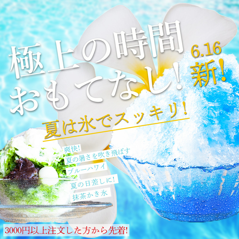 熱い夏に少しでも涼しさを感じてもらえるよう背景には青く澄んだ海を、フォントは明朝体を用いています。冷たくておいしいかき氷に見ていただけるように容器の外側には水滴をつけています。